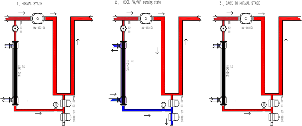 I overensstemmelse med strenge FDA-, USP ASME BPE- og GMP-regler i den farmaceutiske industri. Når systemet ikke fungerer, kan det varme vand i hovedcirkulationen kontinuerligt desinficeres for at opfylde de fleste arbejdsforhold, og der er flere procesmuligheder tilgængelige.